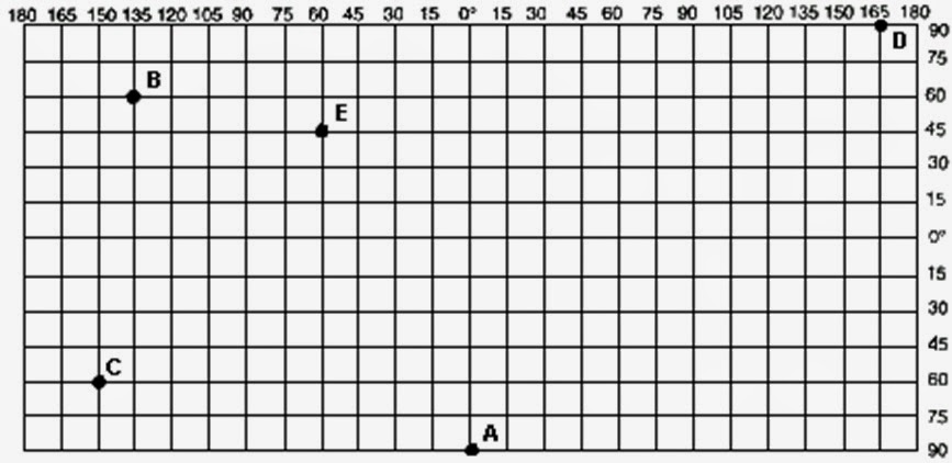 ( ) O ponto E está na posição 30º Lat. Sul e 15